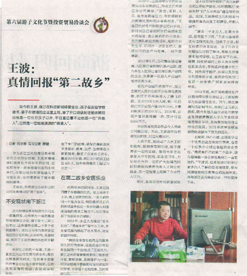 12月11日的《德清新闻》专版报道浙江正元地理信息有限责任公司总经理王波,作为德清县第六届“游子文化节”的一个重要组成部分。
