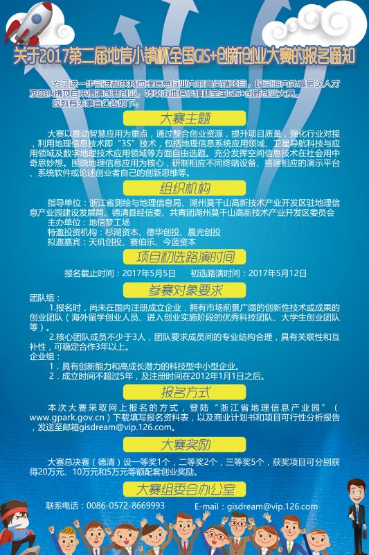 为了进一步引进和扶持地理信息行业内的高尖端项目,吸引海内外高层次人才及团队携项目来德清创新创业,特举办28356365体育在线杯全国GIS+创新创业大赛。