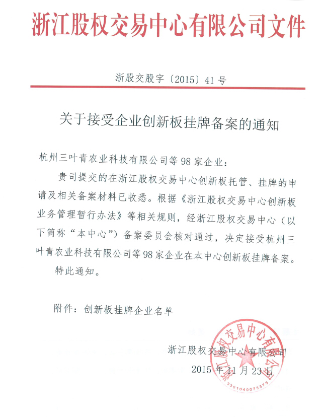 浙江中测新图公司自2014年成立以来,全力发展业务,在开展各项业务的同时,也积极进行上市的准备工作。经过前期调研和申报,浙江公司已于2015年11月23日在浙江股权交易中心成功挂牌企业创新版(新四版)。新四版的成功挂牌,标志着浙江公司在股权改革的道路上又迈进一步,逐步走向资本市场。