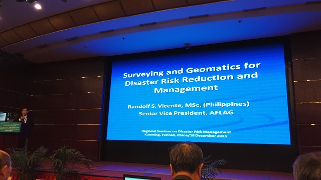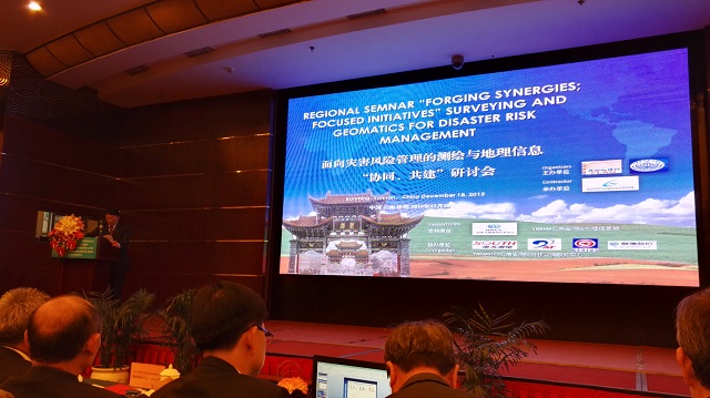 2015年12月18日为面向灾害风险管理的测绘与地理信息“协同、共建”研讨会,约120人参加。上午的会议开幕式由云南省测绘地理信息学会理事长刘继元先生主持。东南亚测绘协会主席默罕默德·阿兹米·莫哈德·辛先生、云南省科学技术协会常务副会长戴陆园先生、中国地理信息产业协会常务副会长兼秘书长胥燕婴先生致辞。然后,中国地理信息产业协会、云南省科学技术协会、云南省测绘地理信息学会等分别与东南亚测绘协会签订合作谅解备忘录。随后,在东南亚测绘协会主席默罕默德·阿兹米·莫哈德·辛先生的主持下,中国国家测绘地理信息局总工程师李志刚先生作了题为“地理信息保障‘一带一路’战略实施”和东南亚测绘协会副主席、菲律宾兰道夫·赛维达尔·韦森特先生作了题为“测绘与地理空间信息用于灾害风险管理”的主题报告。